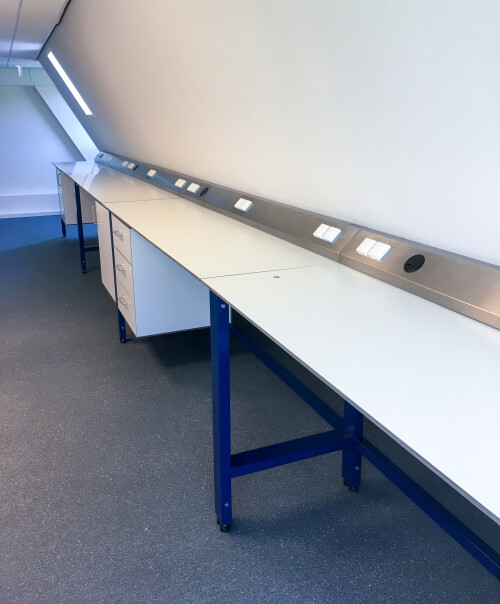 VE-Systems is gestart met een grondige inventarisatie van de gebruikerswensen. Dankzij de eerder verkregen kennis en jarenlange ervaring op het gebied van laboratoriuminrichting kon VE-Systems snel inspelen op de behoeften van Storteboom. Er werd een grove opzet van de werktekeningen gemaakt en vervolgens werd er ingezoomd op de details. Een belangrijke afwijking van de vorige tafels was de wens voor meerdere 230v aansluitingen op de tafels, die vervolgens naar de kabelgoten werden geleid. VE-Systems heeft deze kabelgoten geïntegreerd onder de tafels. Bovendien werd er zorgvuldig gekeken naar de gewenste posities van stopcontacten en doorvoeren. Kleine details die voor de gebruikers een groot voordeel opleveren.