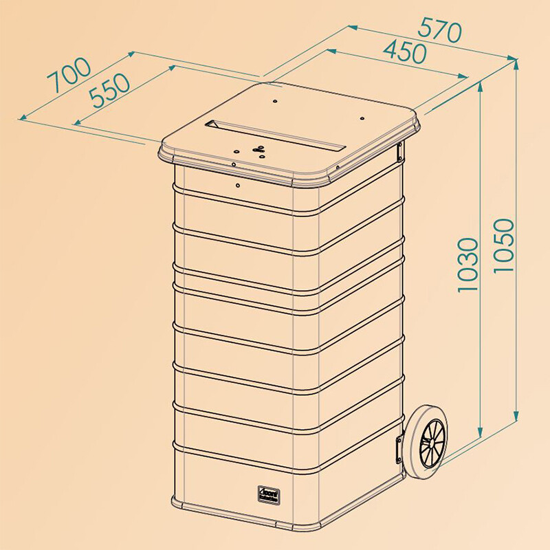 De wielen Ø 200 mm en de handgreep aan de achterzijde zorgen ervoor dat de container eenvoudig te verplaatsen is. De inhoud van de container is 240 Liter. Standaard wordt de container geleverd met een afsluitbare vergrendeling.