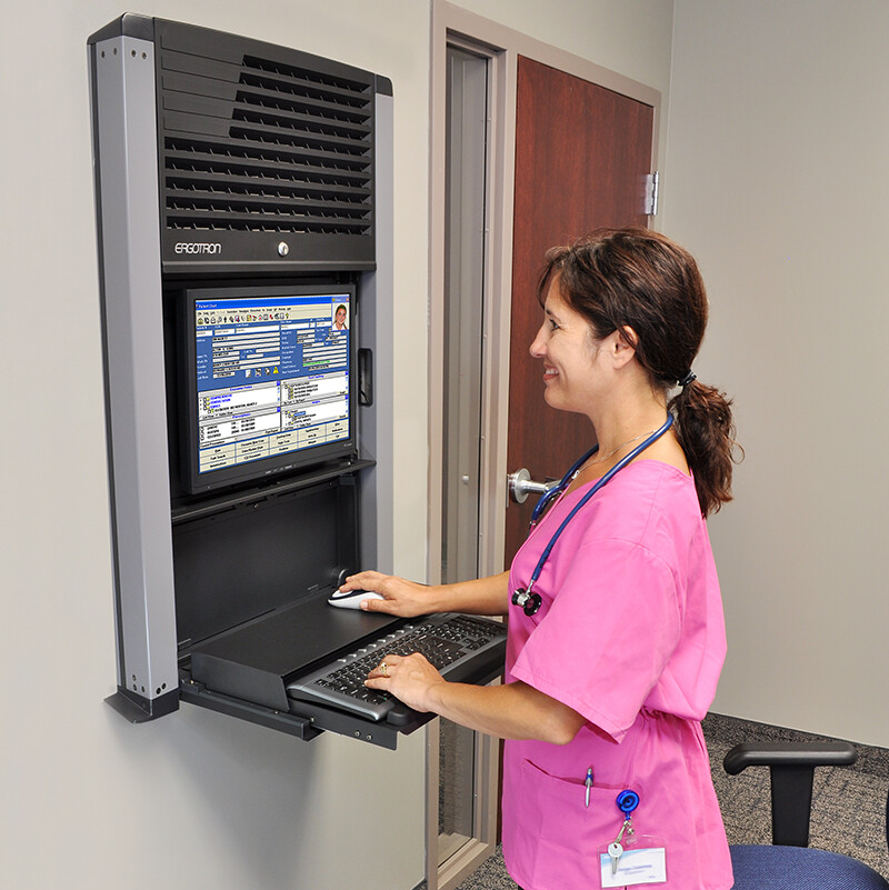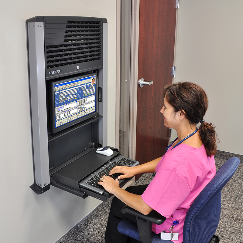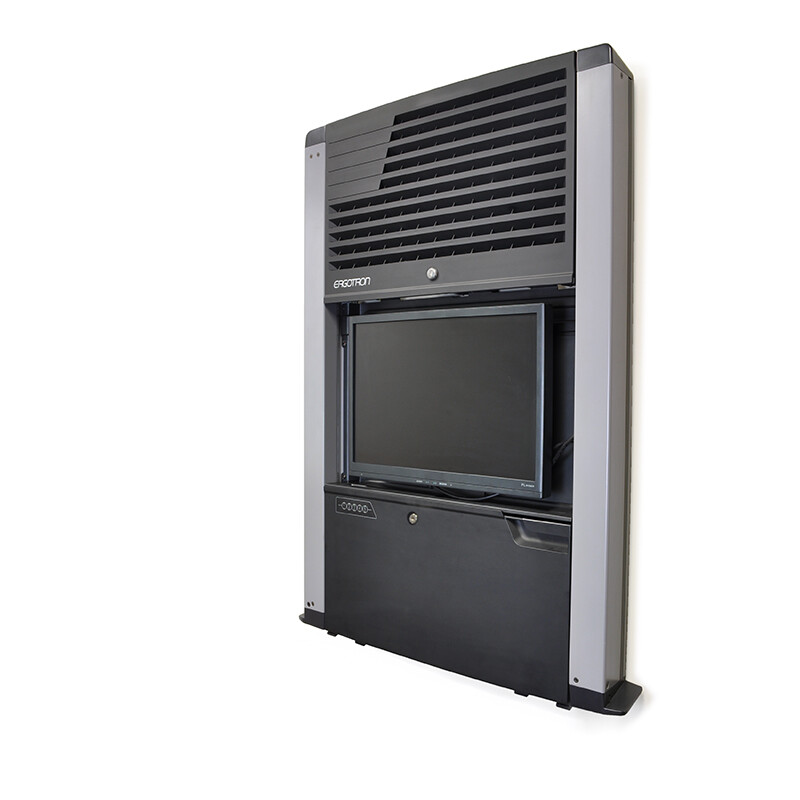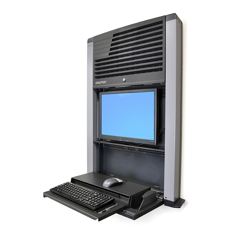 Met een traploze verstelbaarheid van 510 mm kan iedereen de ideale werkhoogte bepalen, zowel zittend als staand. De monitor is maximaal 22" groot en het toetsenbord wordt bevestigd met de meegeleverde klittenband. De diepte met uitgeklapt toetsenbord is 490 mm. Met een ingeklapt toetsenbord kan het met een sleutel worden afgesloten. Er is een aparte afgesloten ruimte voor de thin client met ventilatie openingen.